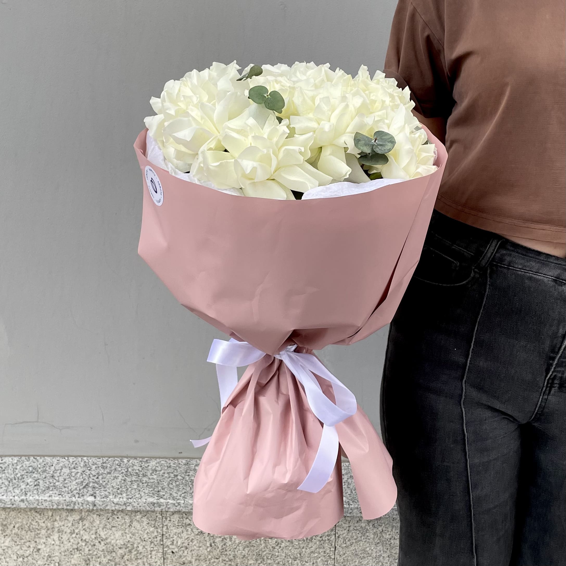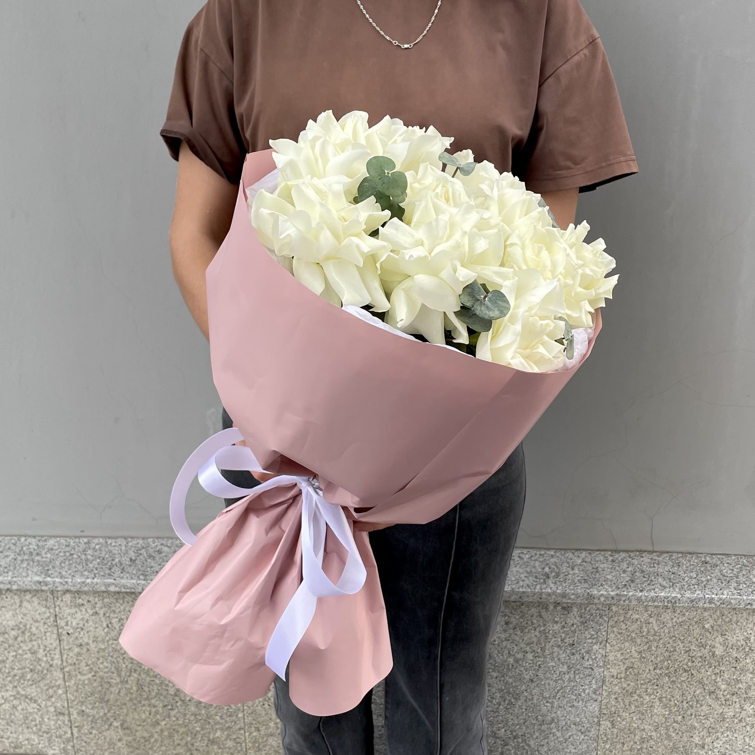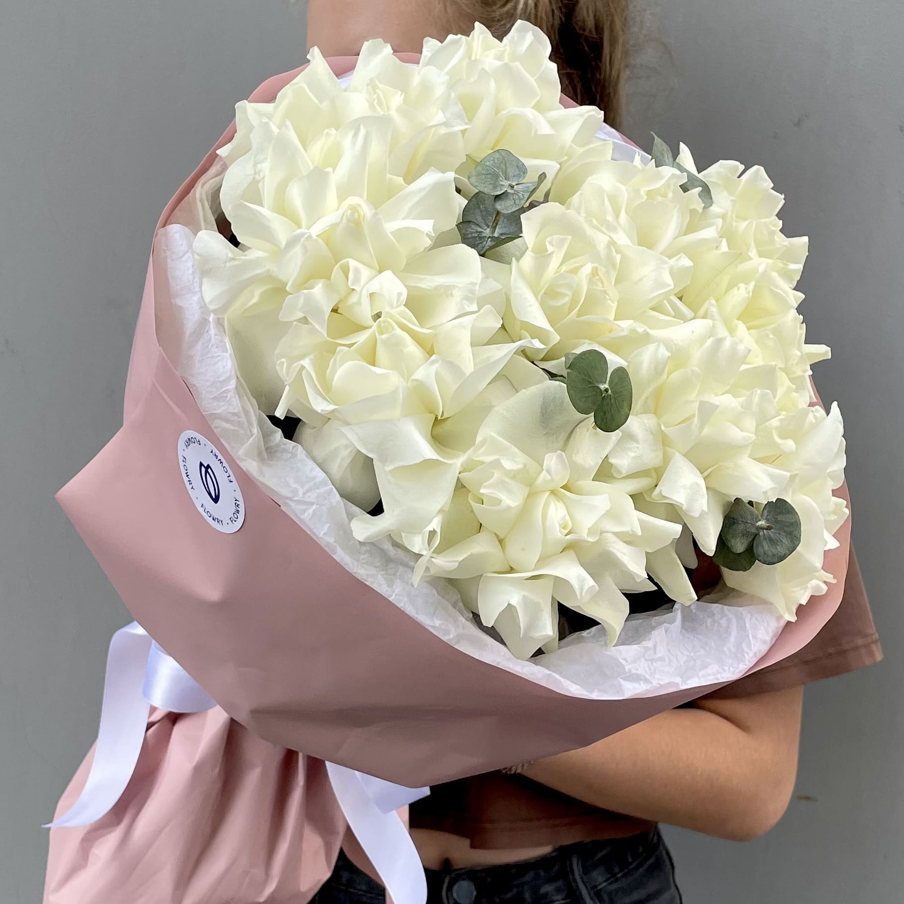 В составе букета 11 французских роз белого цвета с эвкалиптом