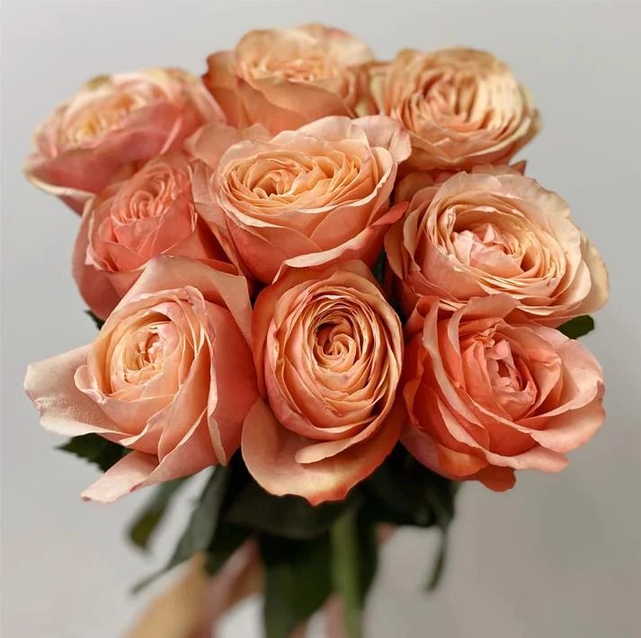Главная / Каталог / Цветы / Розы / Пионовидные розы / 9 персиковых пионовидных роз Эквадор 60 см