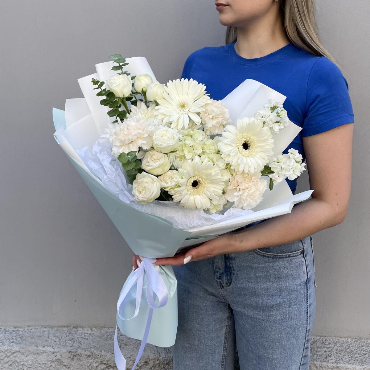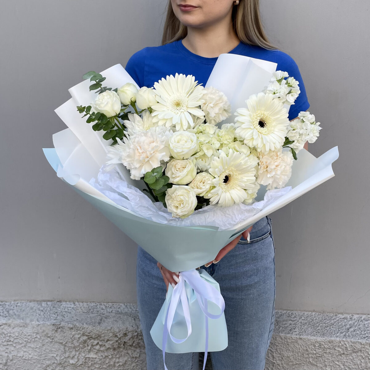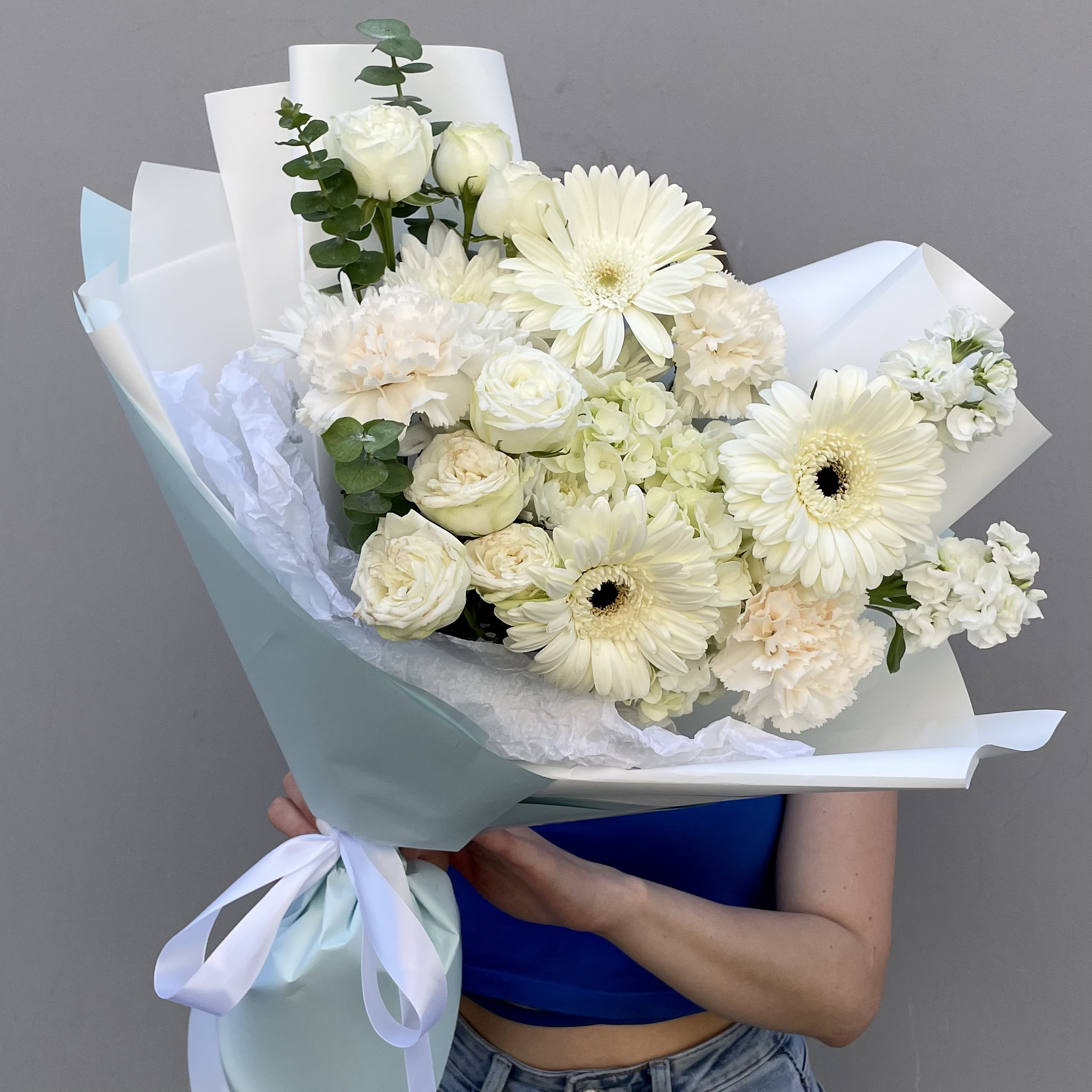 Сборный букет с нежными белыми герберами и ароматными маттиолами