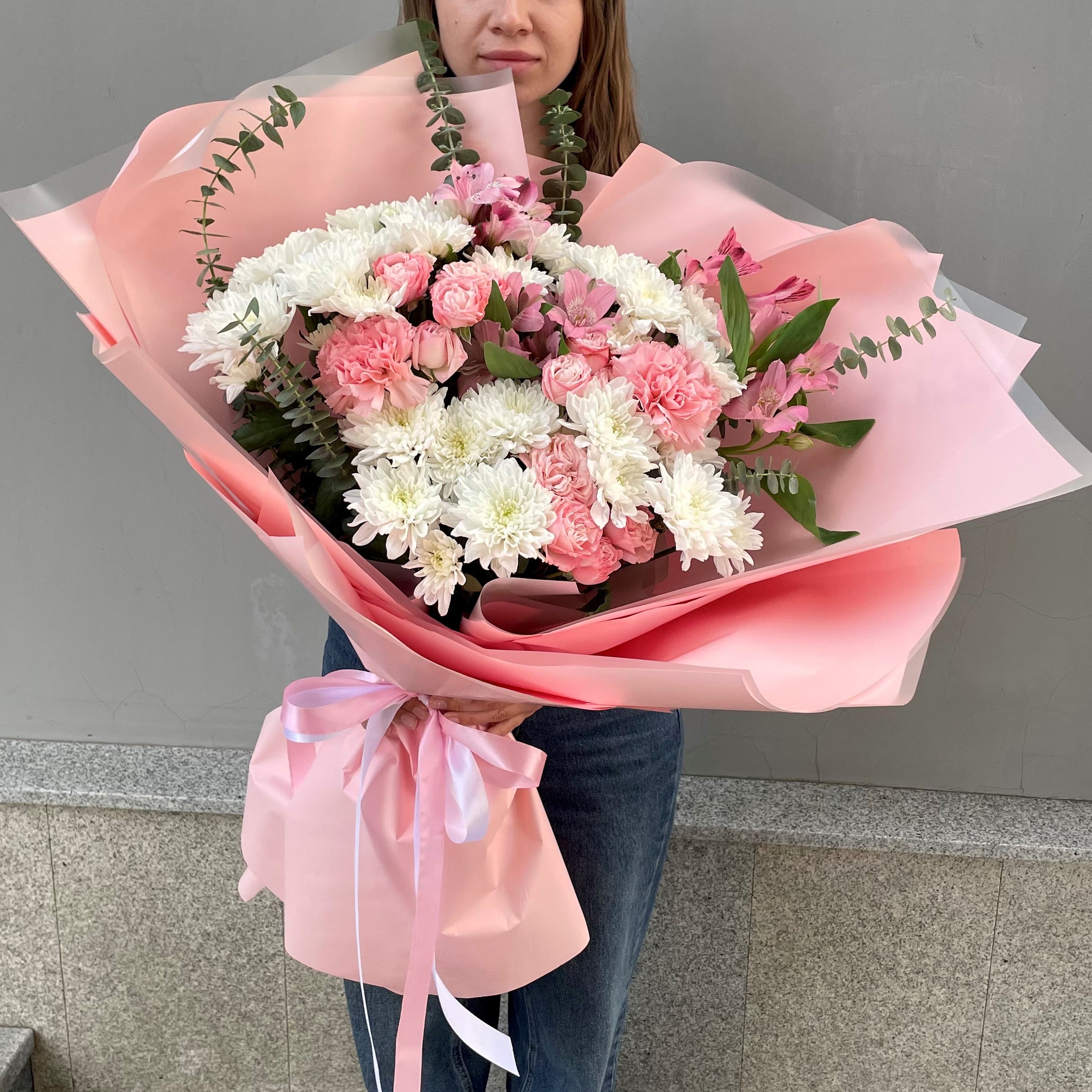 Букет-гигант из пушистых хризантем, ароматных диантусов, пионовидных роз и альстромерий в нежном розовом оформлении