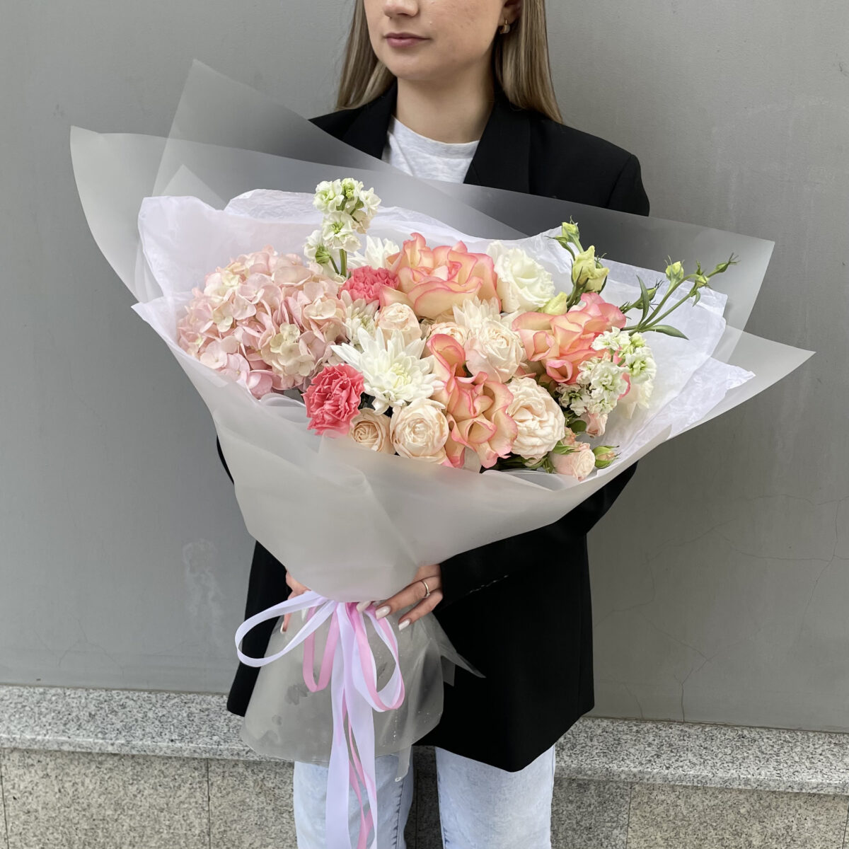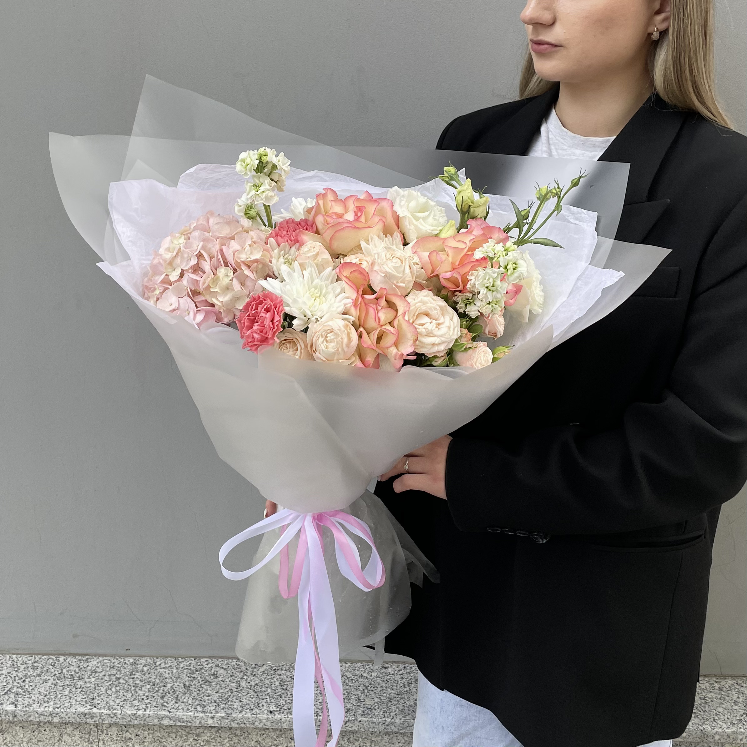 Свежий и нежный авторский букет в розовых и белых тонах станет прекрасным подарком для особого случая.