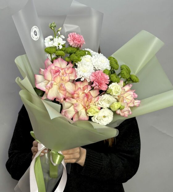 Нежный букет из 21 кустовой розы белого и розового цвета