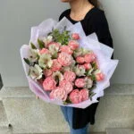 Букет из 6 кустовых пионовидных роз и 7 альстромерий