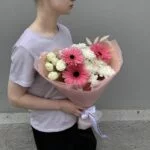 Сборный букет №5 – уникальное сочетание цветов, создающее удивительную атмосферу нежности. В этом букете сочетаются белая хризантема, кустовые розы, розовые герберы.